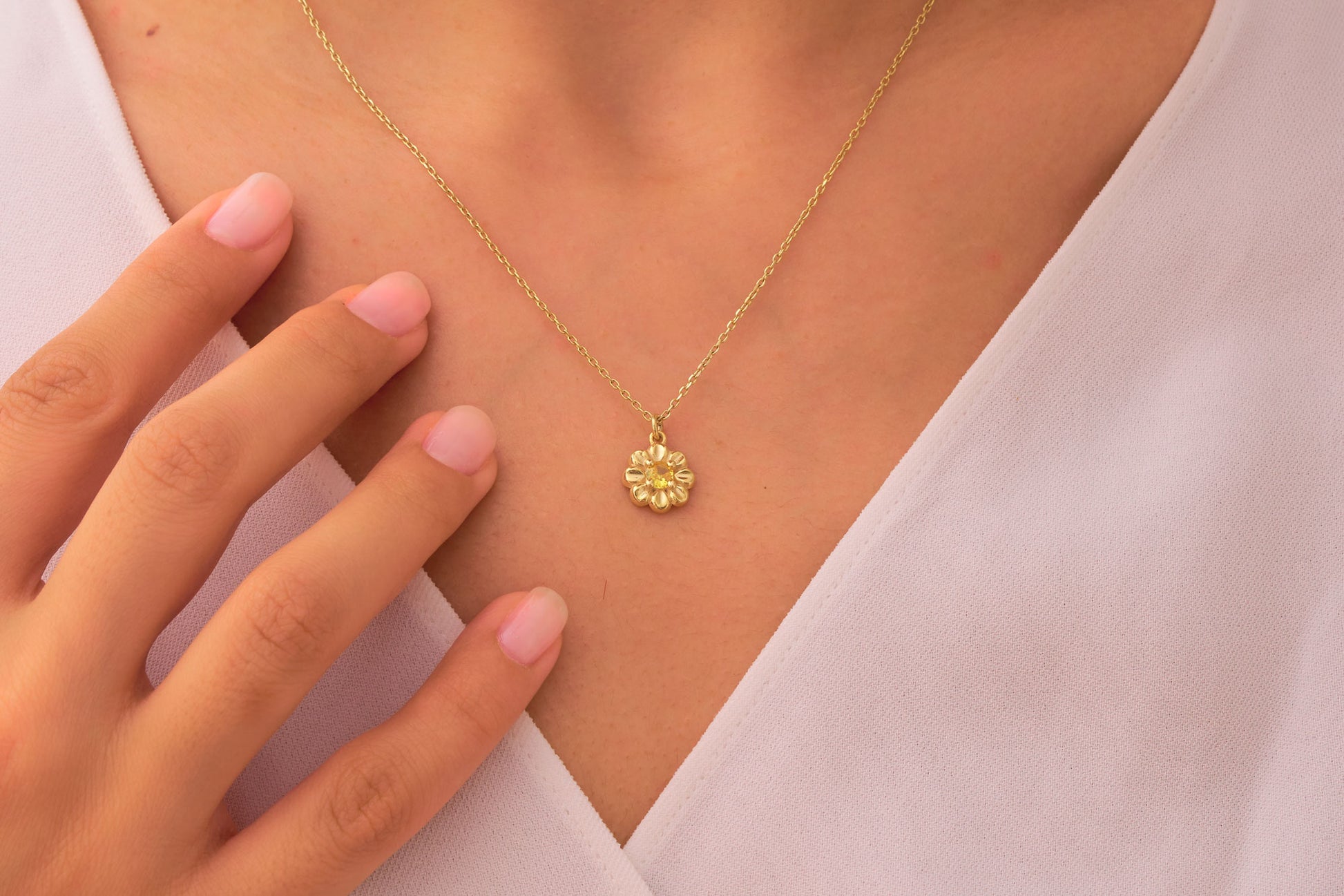Dainty Daisy Flower Necklace with Citrine Stone: Nature Inspired Jewelry in Silver & Solid Gold