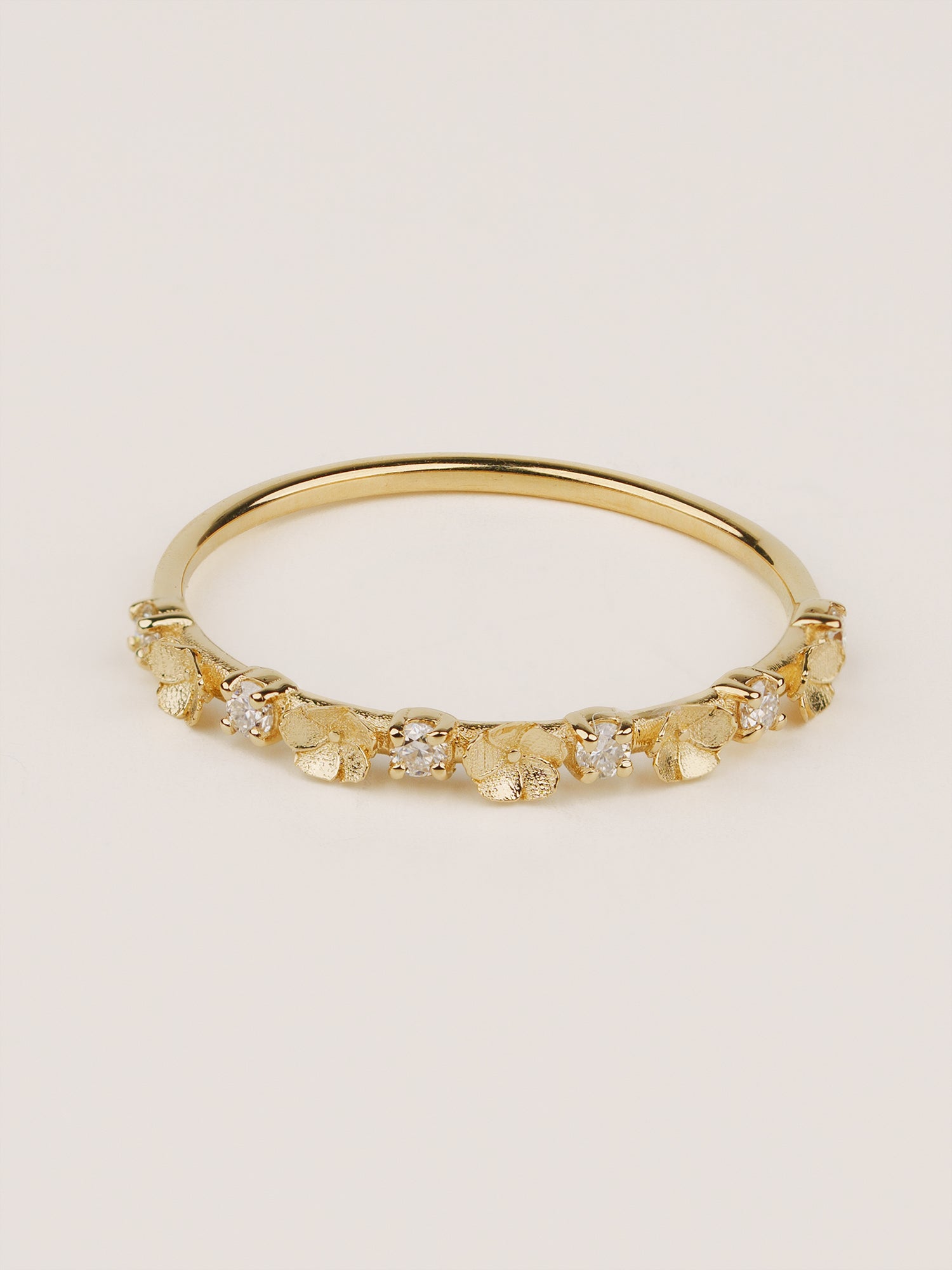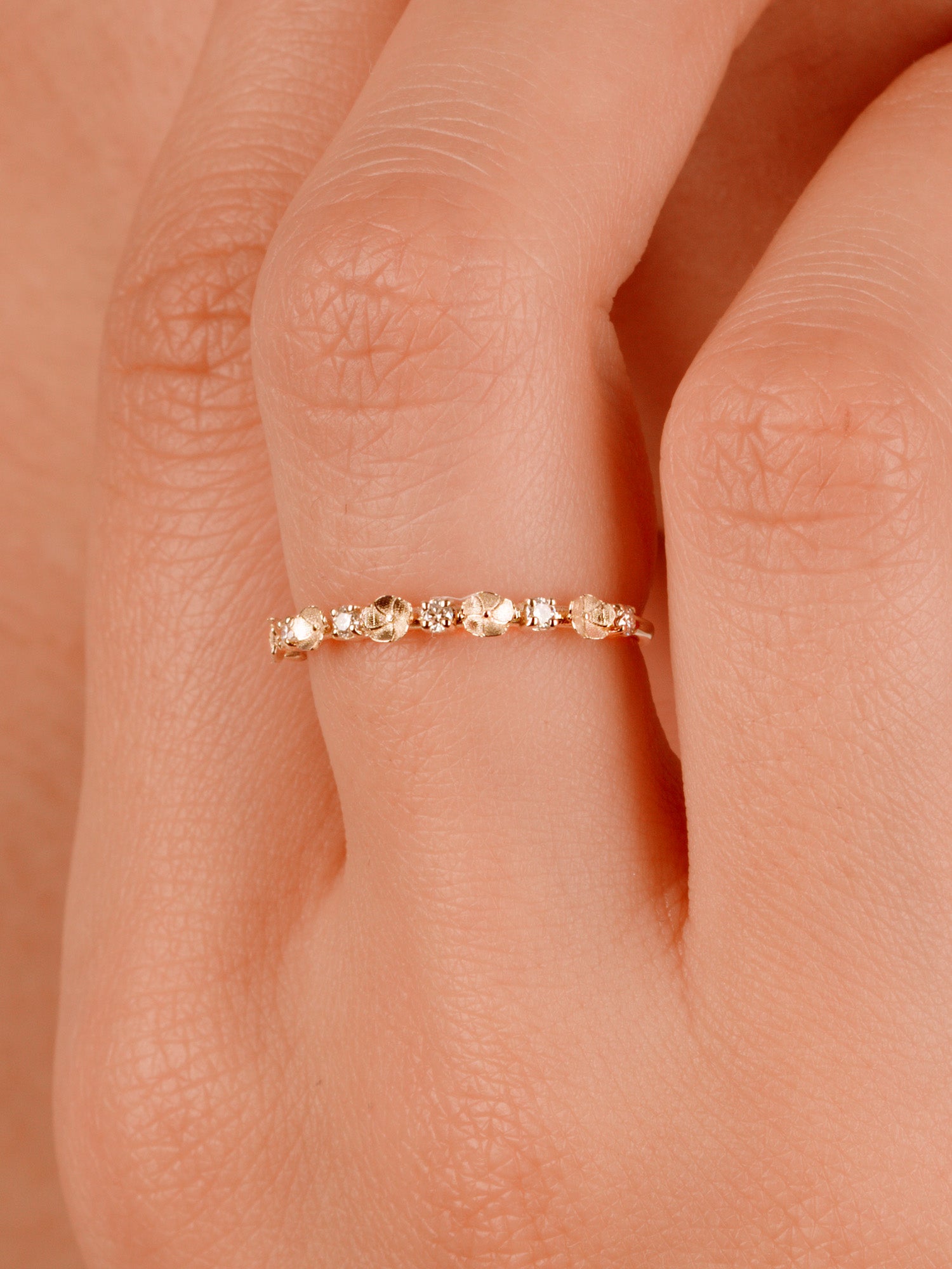 Flowers symbolize growth, renewal, and beauty, making this ring a meaningful piece that represents new beginnings and cherished moments. The delicate petal detailing brings a soft, organic feel, enhanced by sparkling diamonds that catch the light beautifully.