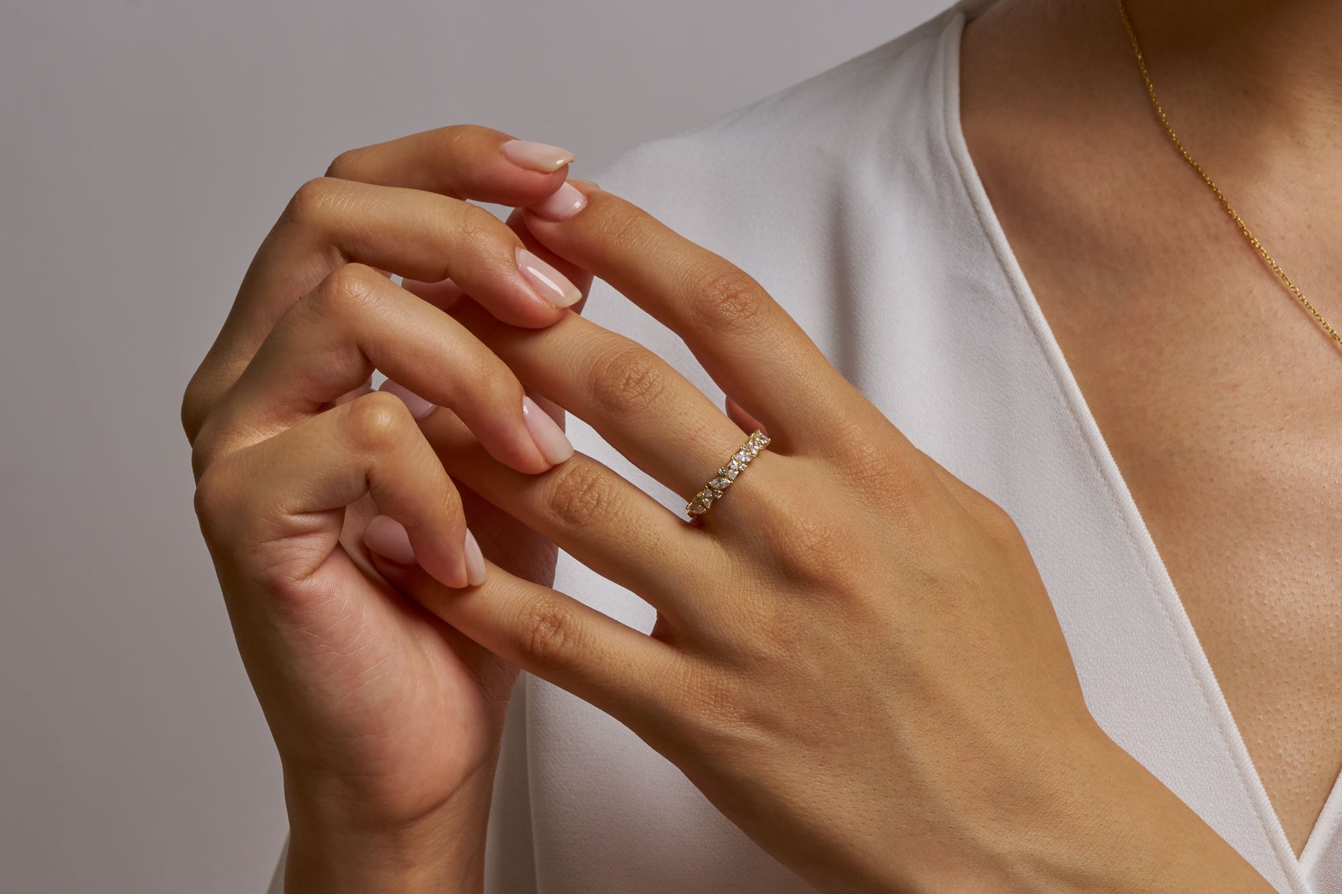 Keep your ring looking radiant by avoiding harsh chemicals, storing it in a soft pouch or box, and cleaning with warm water and a soft cloth.