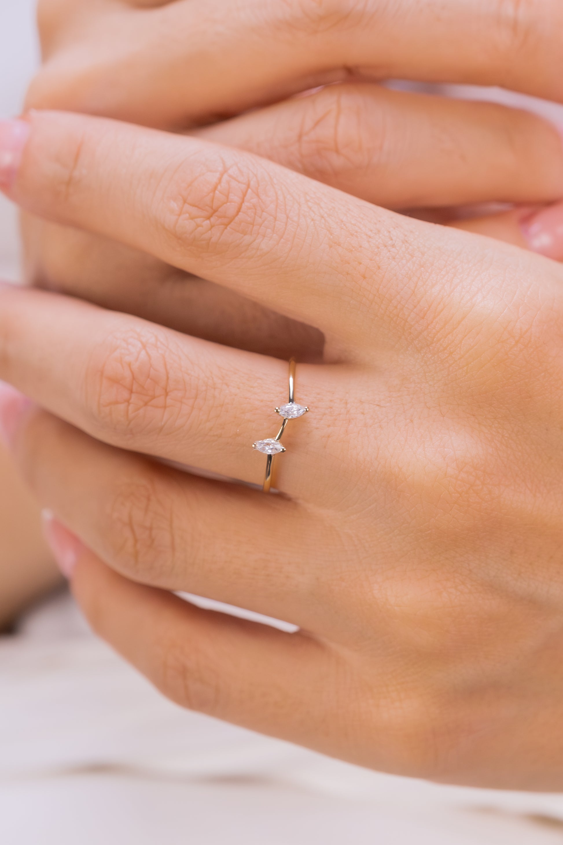 Prepare to dazzle with a ring that perfectly blends minimalism and elegance. Our Delicate Double Marquise Cut Ring is crafted in 14K solid gold, featuring two exquisite marquise-cut stones that gracefully float on a slender, open band. This ring is the epitome of everyday luxury, offering a versatile charm that enhances every look!