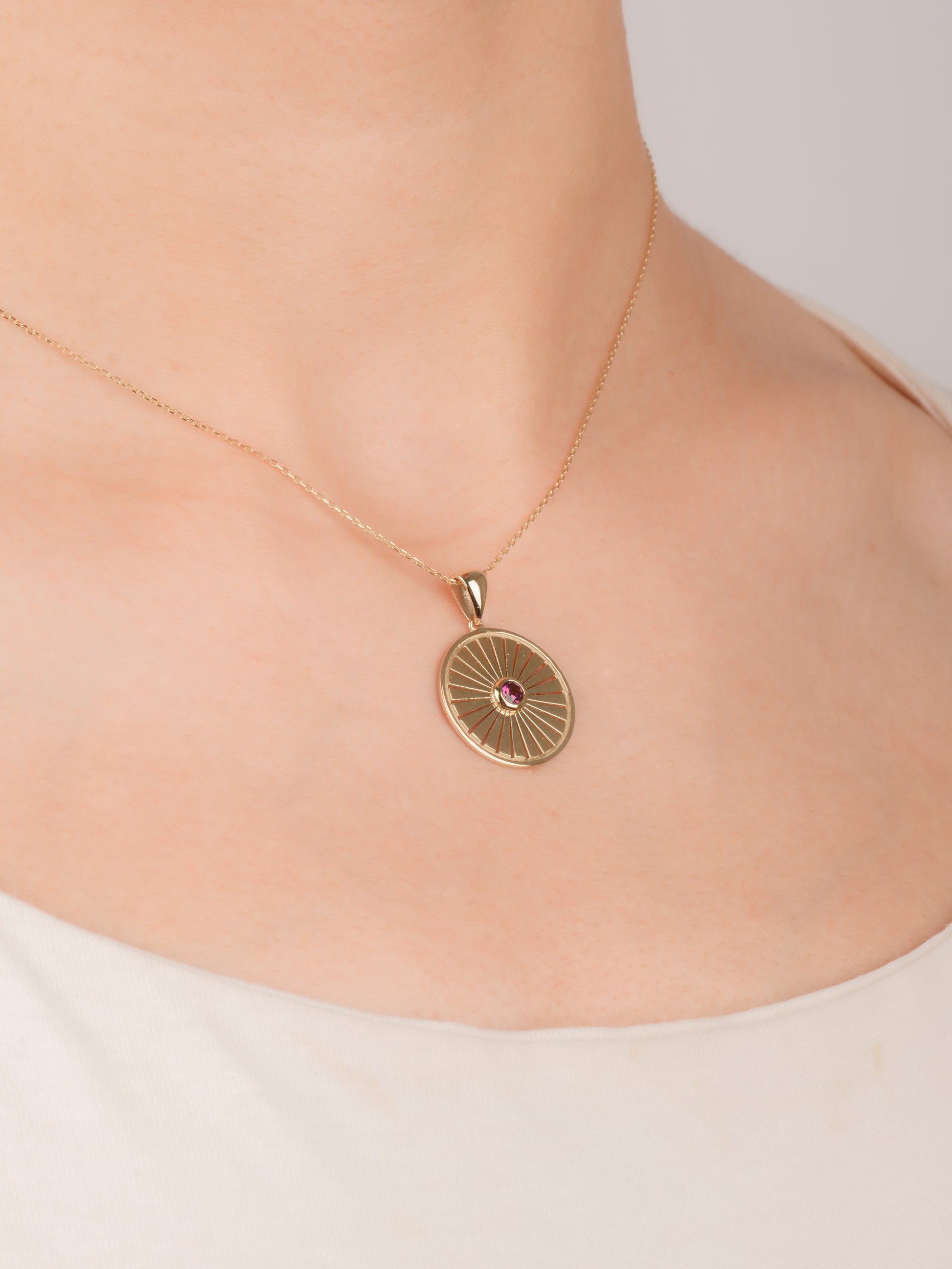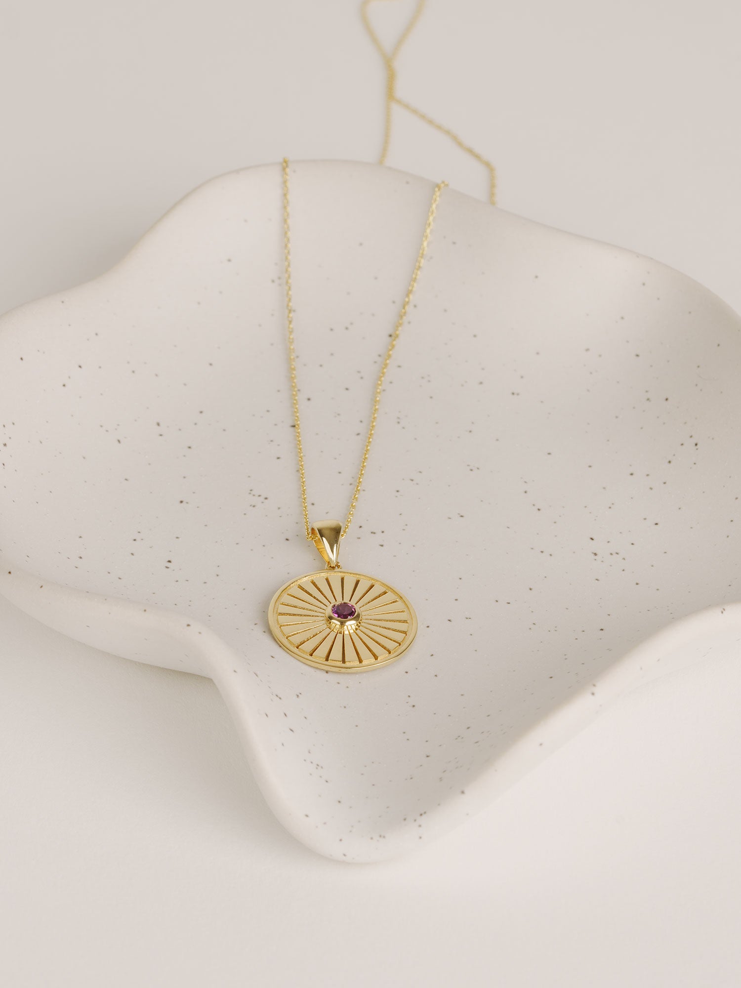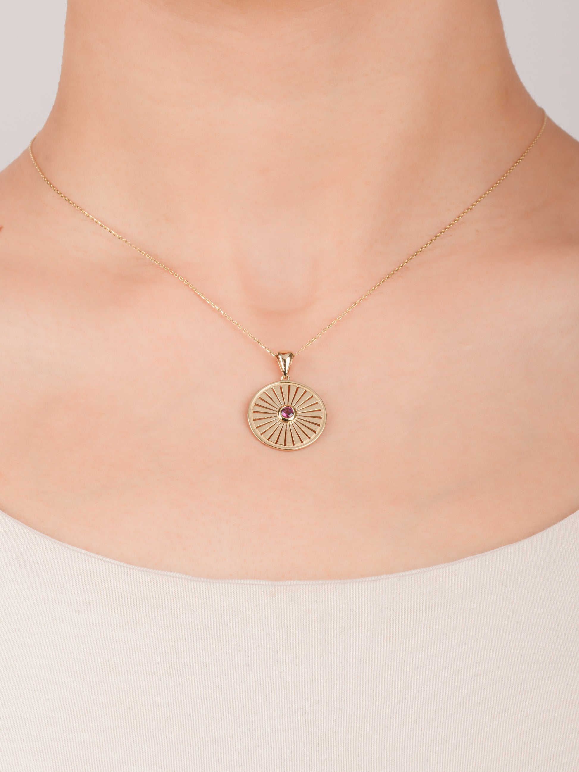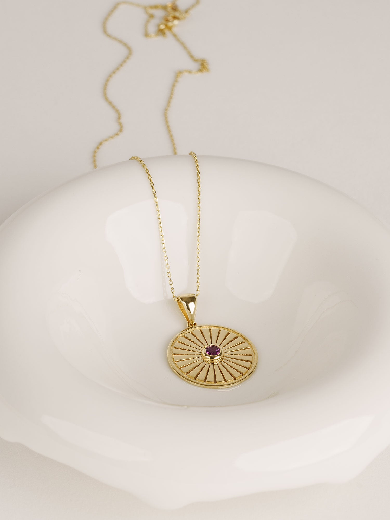 14 Ayar Altın Güneş Patlaması Ametist Kolyemizin zamansız zarafetiyle tarzınızı aydınlatın. Bu zarif parça, her hareketle ışıldayan büyüleyici mor bir ametistle merkezlenmiş, titizlikle hazırlanmış bir güneş patlaması madalyon tasarımına sahiptir.