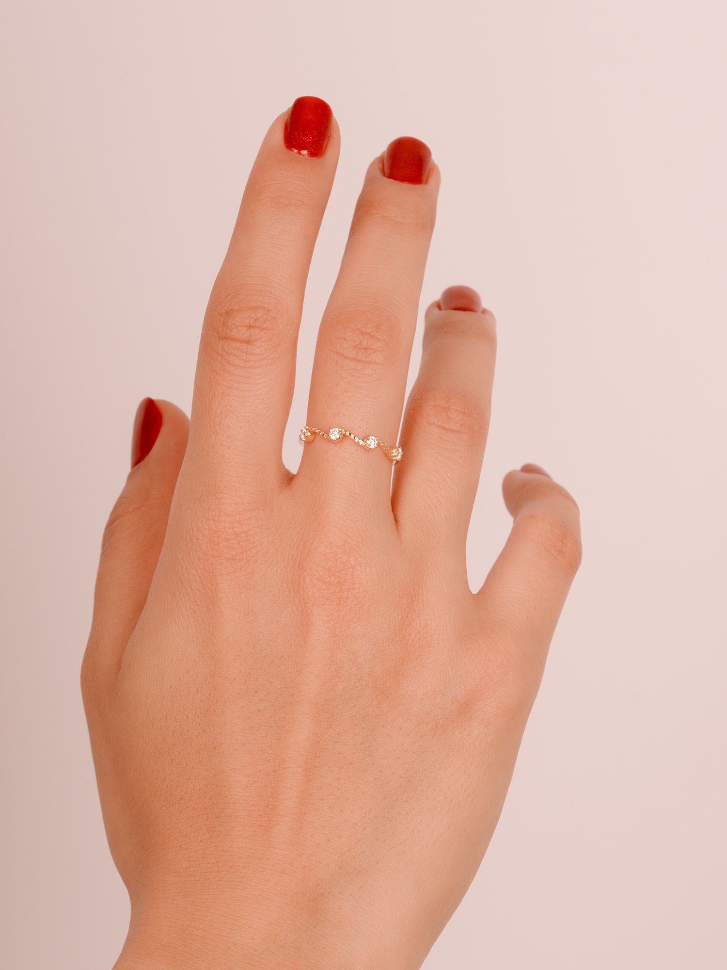 Minimalist, zarif ve güzel bir şekilde el işçiliğiyle üretilen bu 14 Ayar Altın Dalgalı Pırlanta Yüzük, mükemmel bir modern üst üste takılan bant veya alyanstır. İster tek başına ister diğer parçalarla birlikte takılmış olsun, sonsuza dek parlamak üzere tasarlanmıştır.
