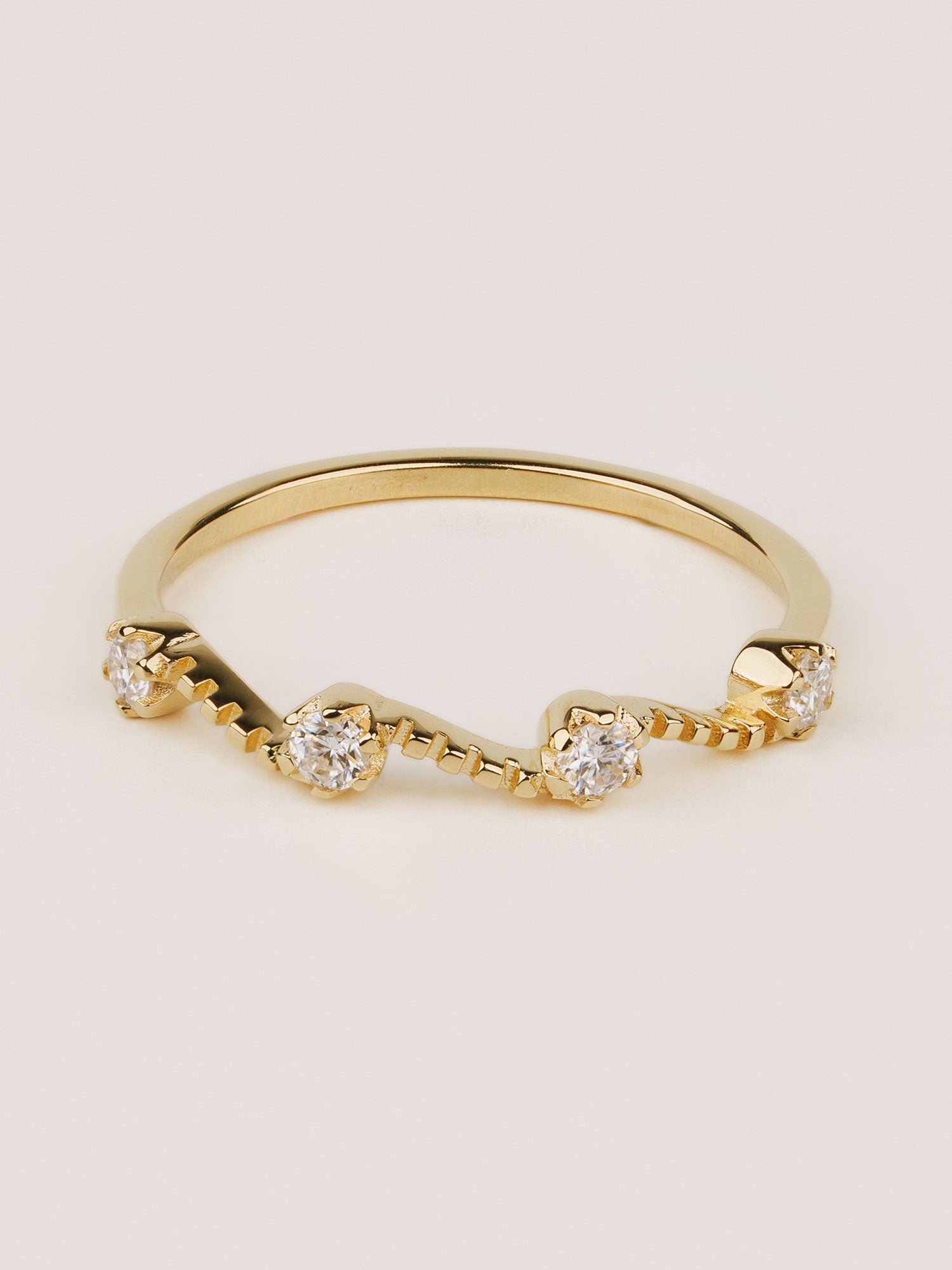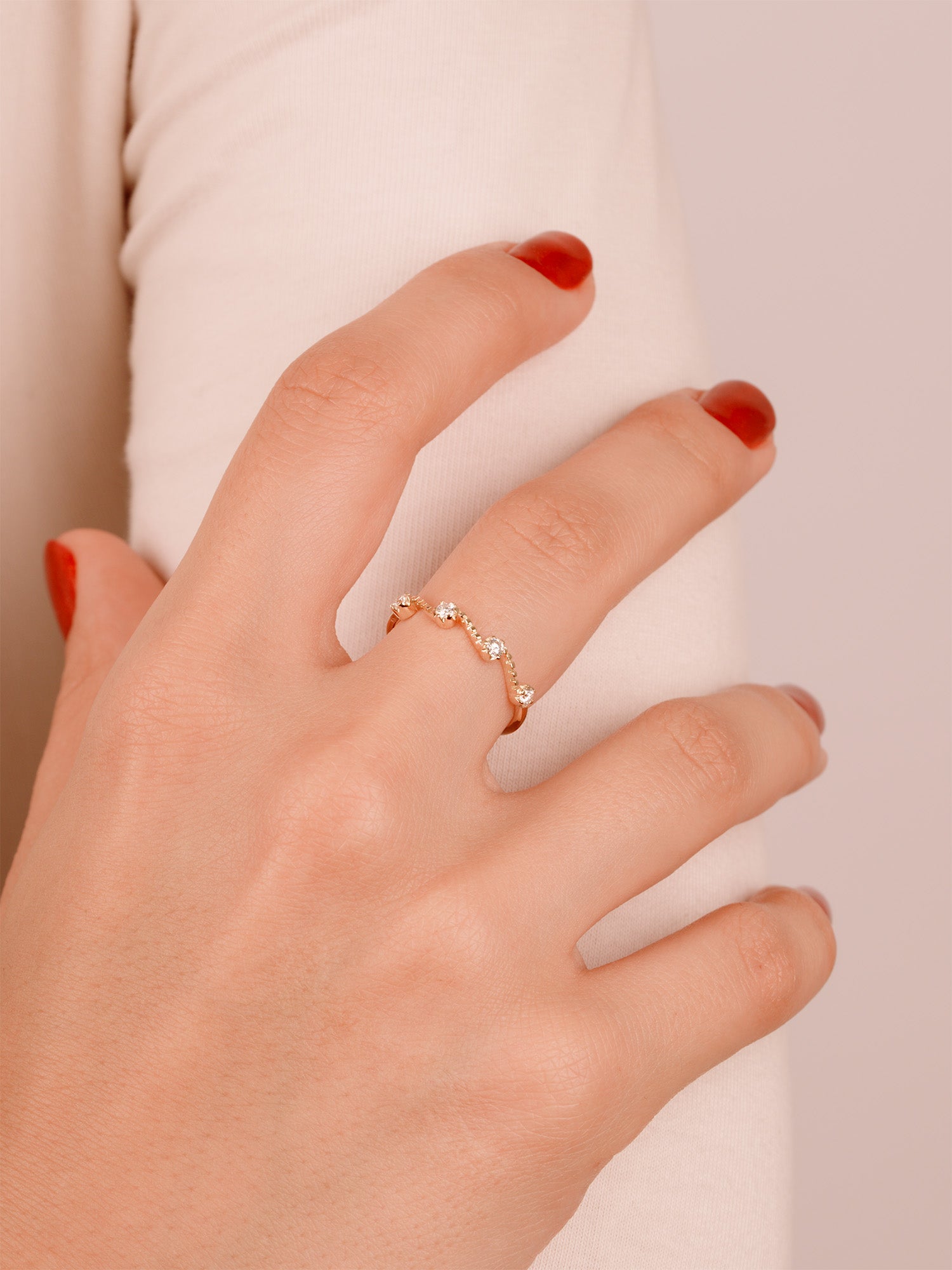 Bu zarif dalga şeklindeki bant, uyumu, akışı ve zahmetsiz güzelliği temsil eder. Yumuşak eğrilik, parmağın doğal formunu takip ederek hem rahat hem de görsel olarak büyüleyici hale getirir. Her elmas, dalgaların zarif hareketini simgeleyen ışıltılı, akıcı bir tasarım yaratmak için titizlikle yerleştirilmiştir.