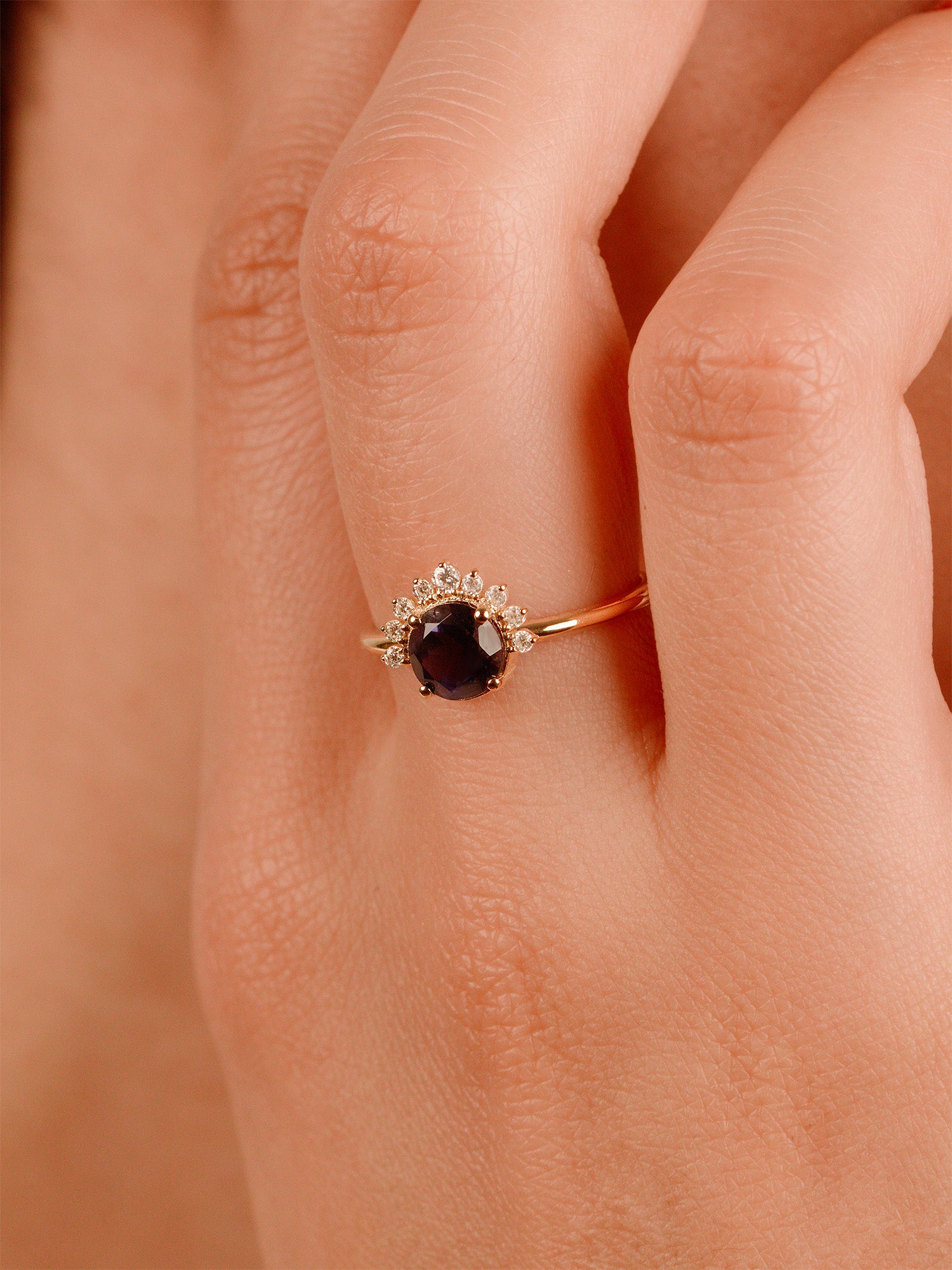 ✨ Sofistike ve Benzersiz – Geleneksel nişan yüzüklerinin aksine, bu siyah iolit yüzük, ayırt edici rengi ve vintage esintili pırlanta kümesi yerleşimiyle öne çıkıyor.