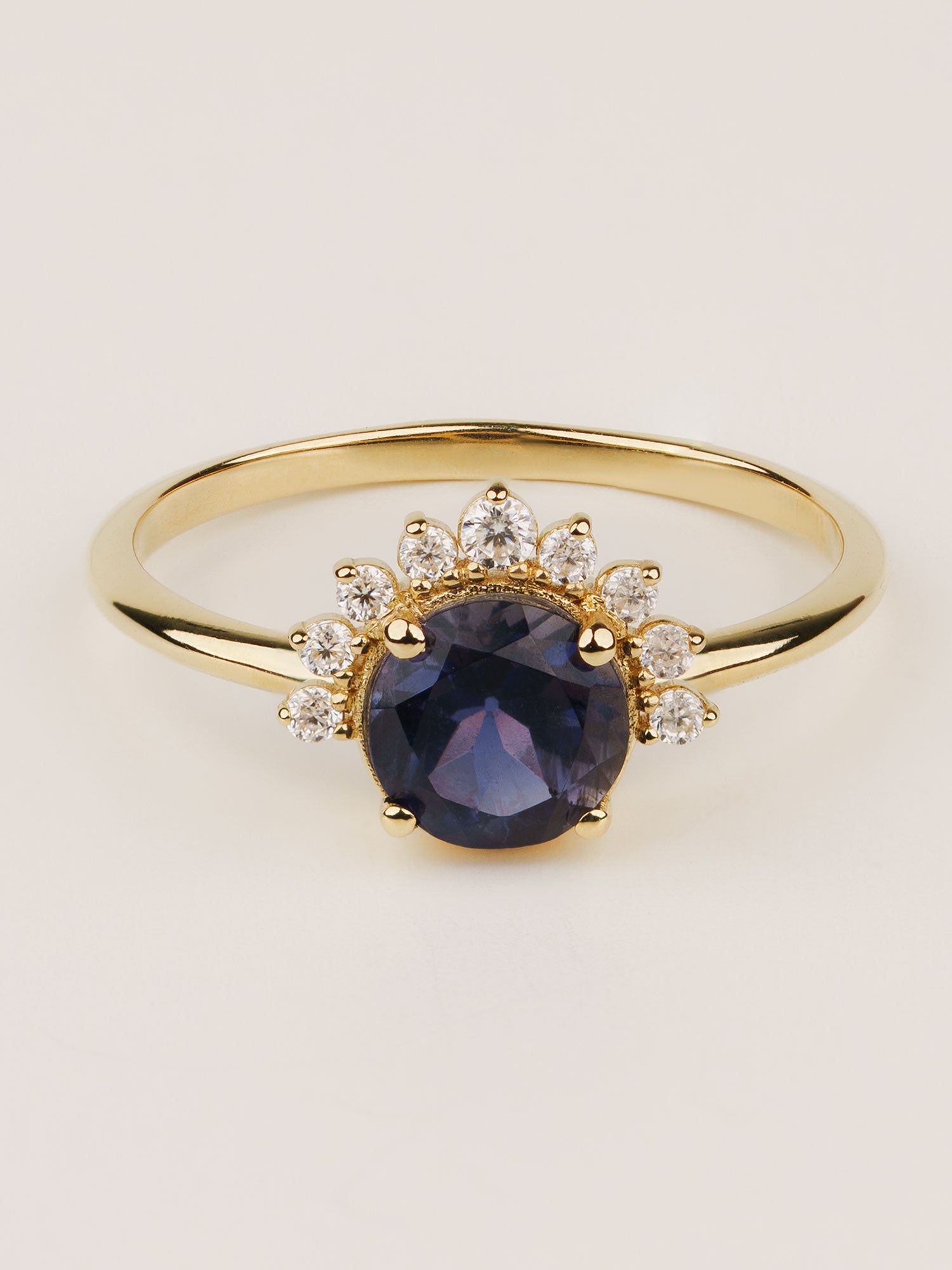İolitin göz alıcı koyu tonu, zarif bir beyaz elmas kümesiyle muhteşem bir şekilde tamamlanarak, uhrevi ve ışıltılı bir etki yaratıyor.