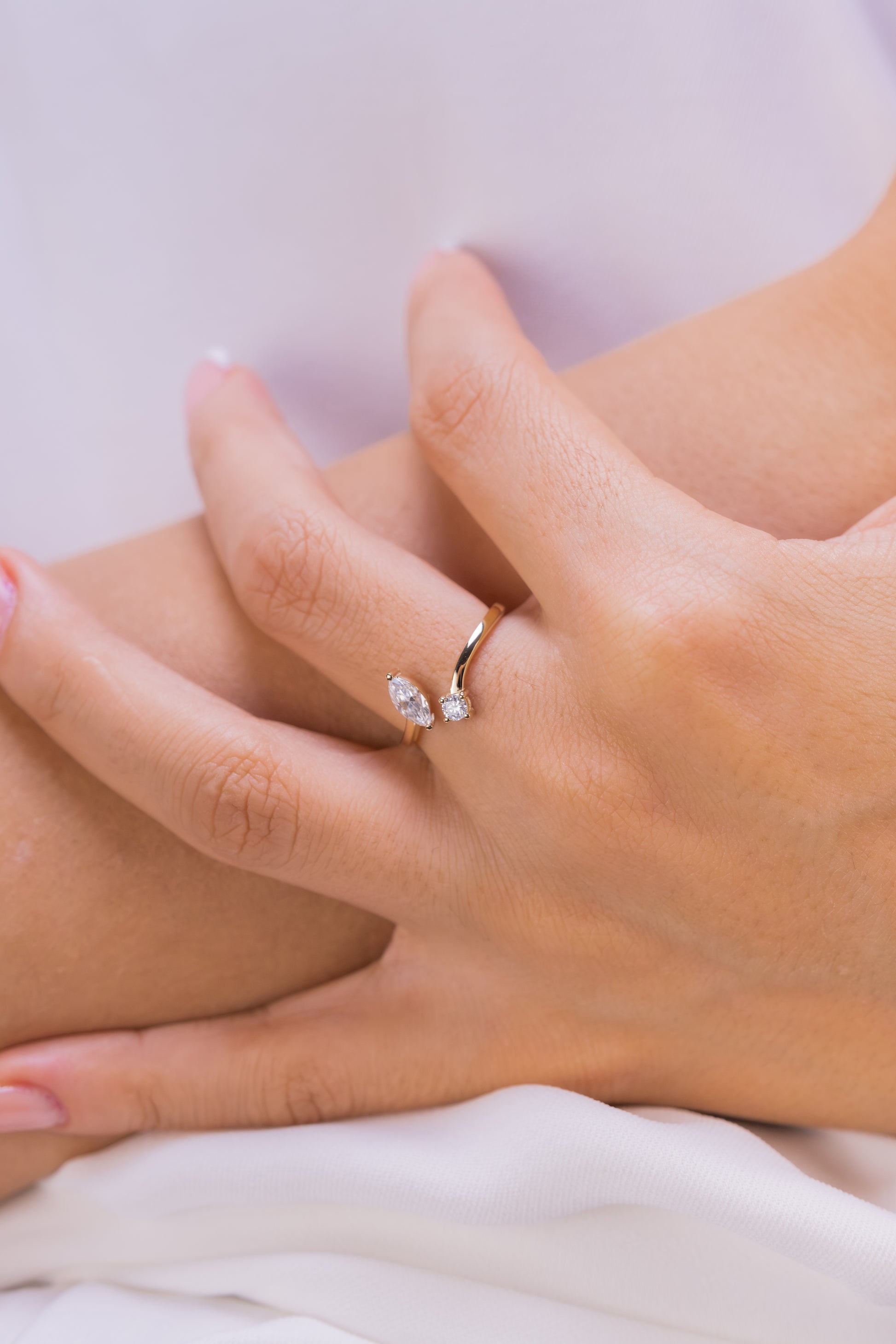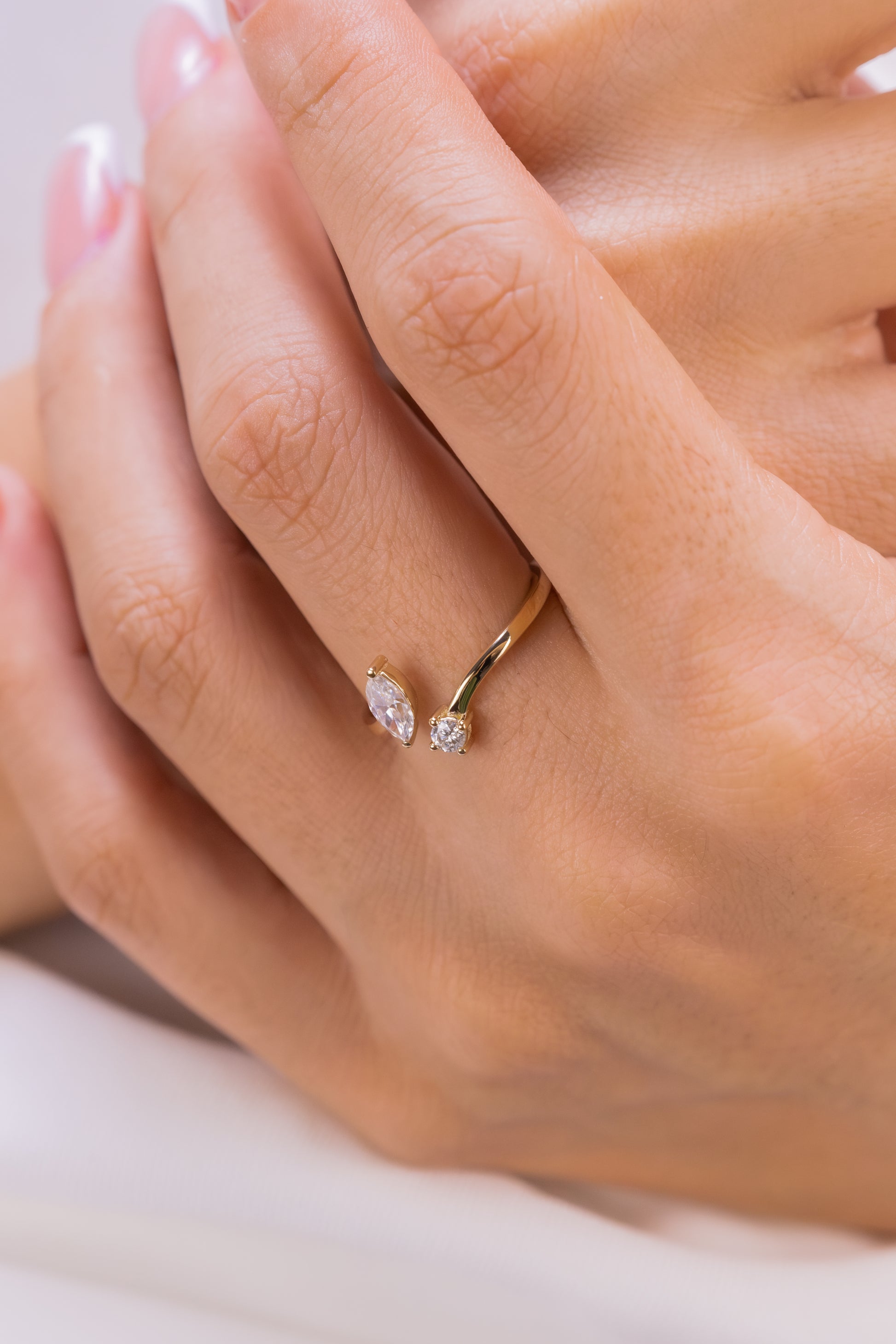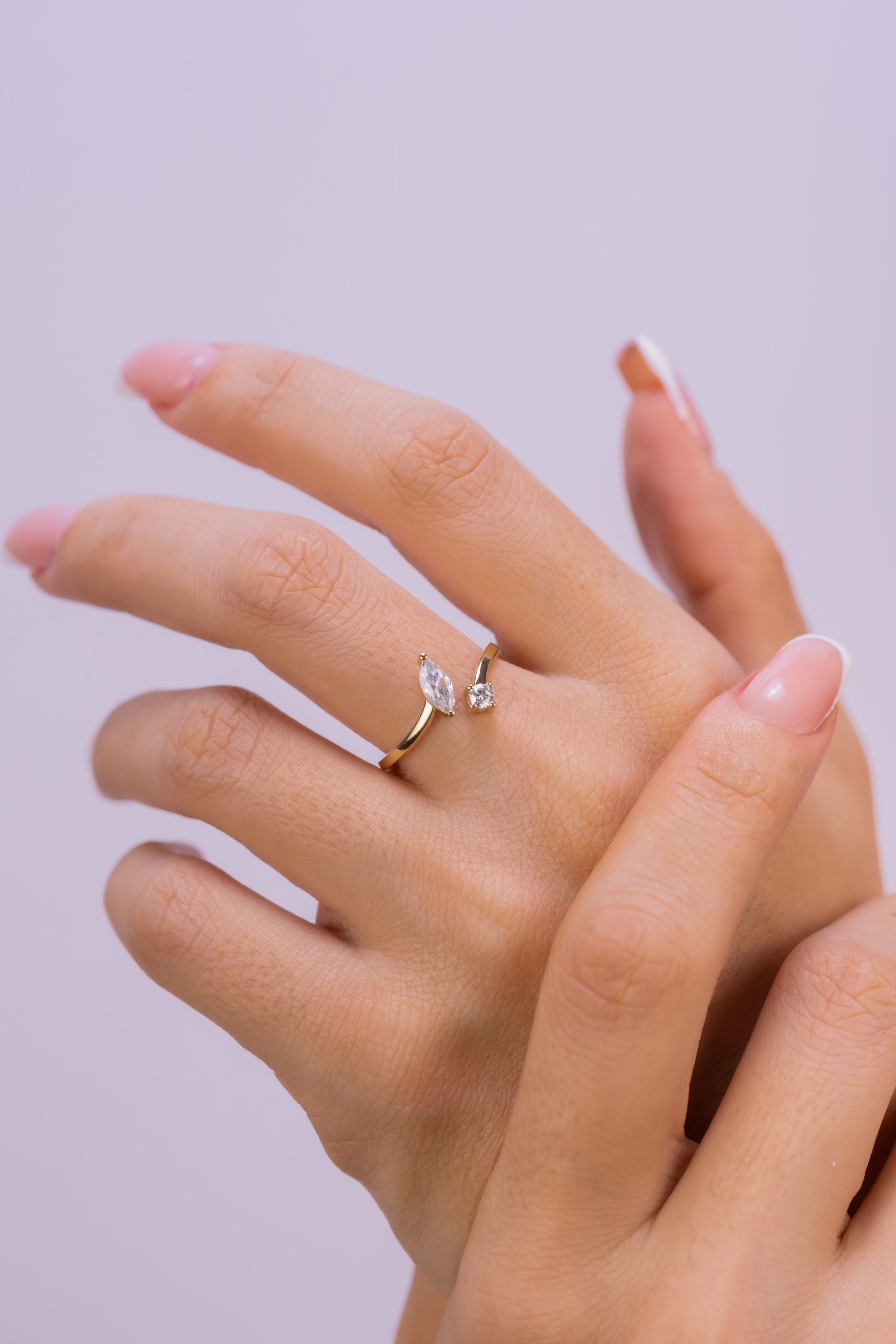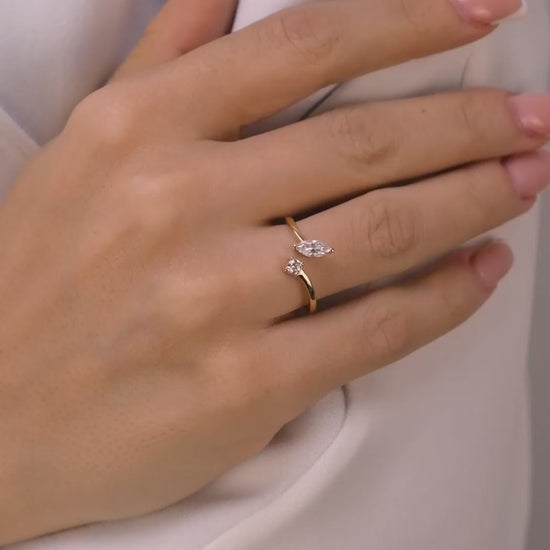 Markiz ve Yuvarlak Pırlanta Açık Yüzük – 14 Ayar Altın Minimalist Ayarlanabilir Yüzük