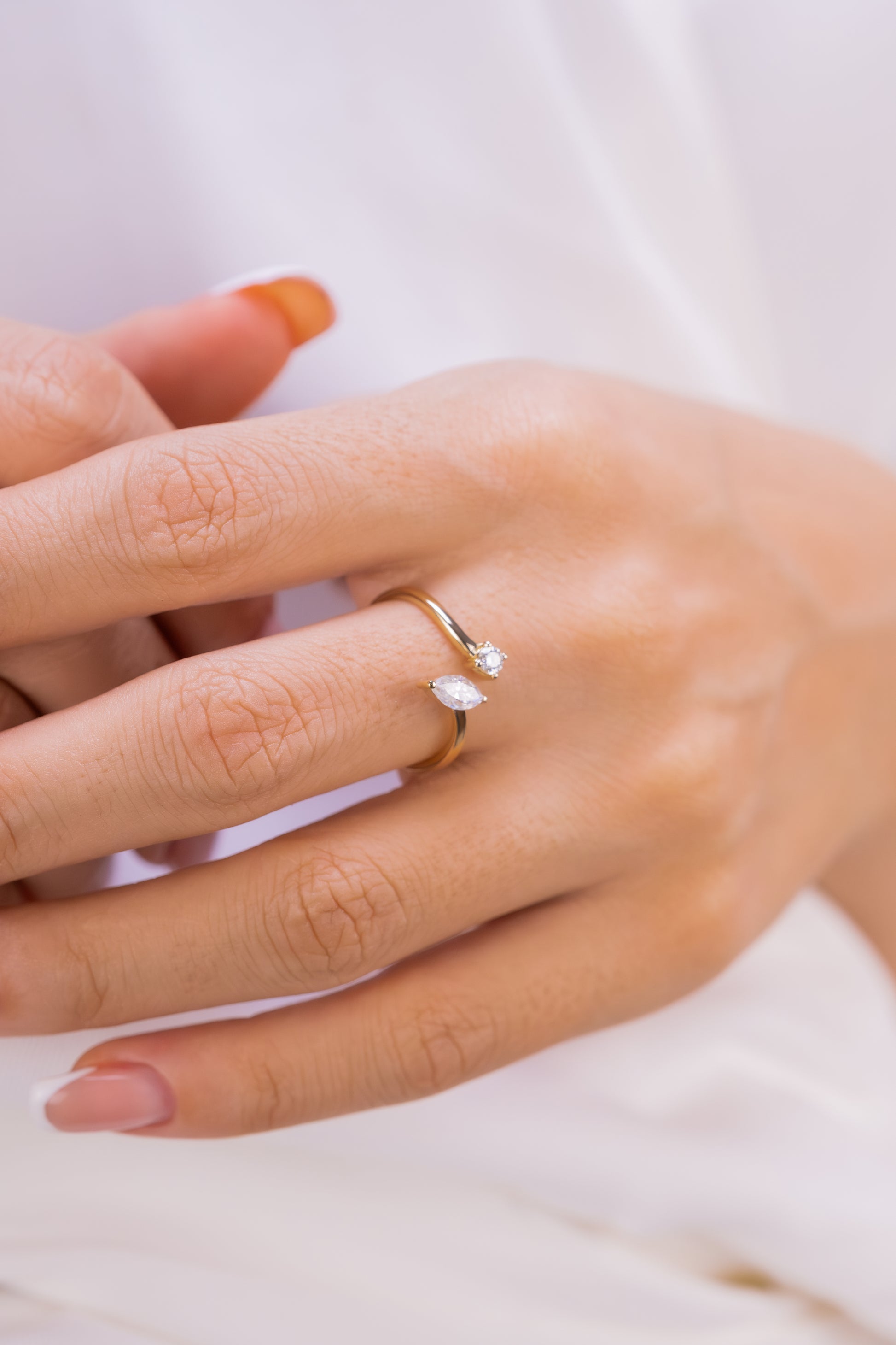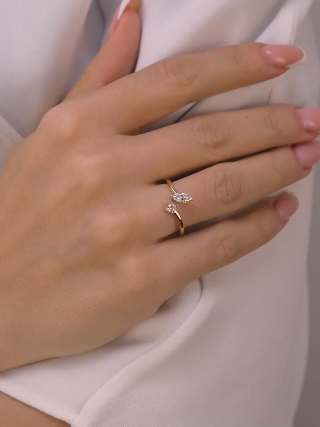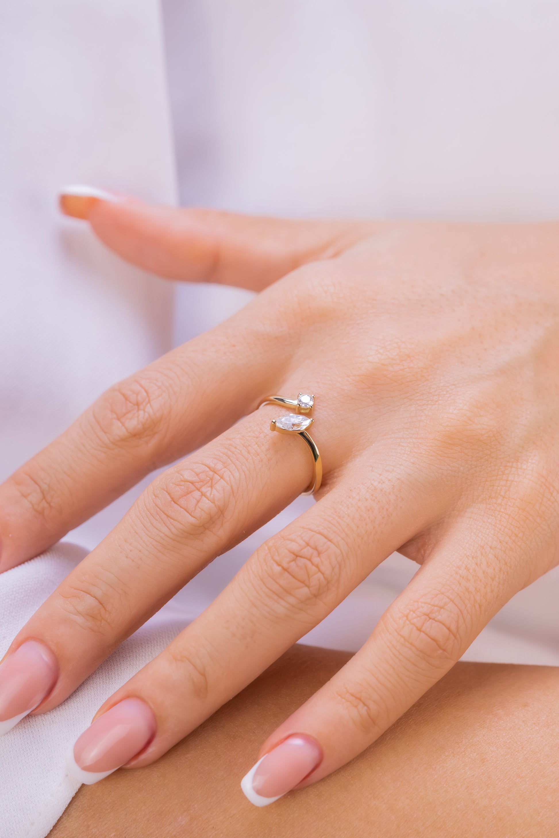 Markiz ve Yuvarlak Pırlanta Açık Yüzük – 14 Ayar Altın Minimalist Ayarlanabilir Yüzük
